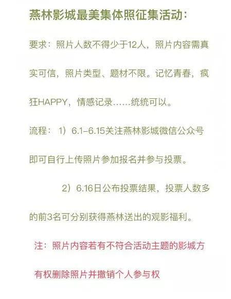 以上观影福利以封面照片人数为准,仅限一次性统一领取(注:每个奖项仅用于同一场次观影),请提前3天联系影城预约(联系方式:13305903590),福利领取有效期至2017年7月15日前,影片以影城现有排期为准,该项观影福利黄金时间段不可使用。