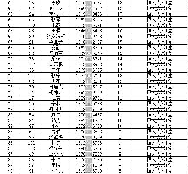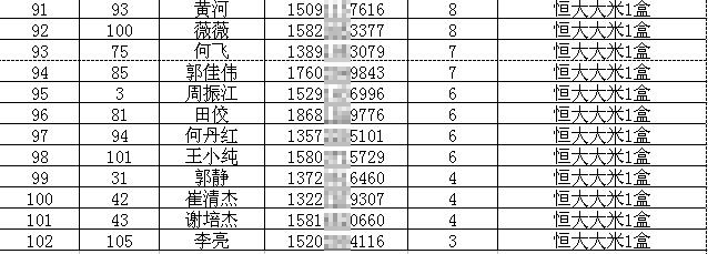 参与奖(票数榜第37-136名):恒大大米1盒