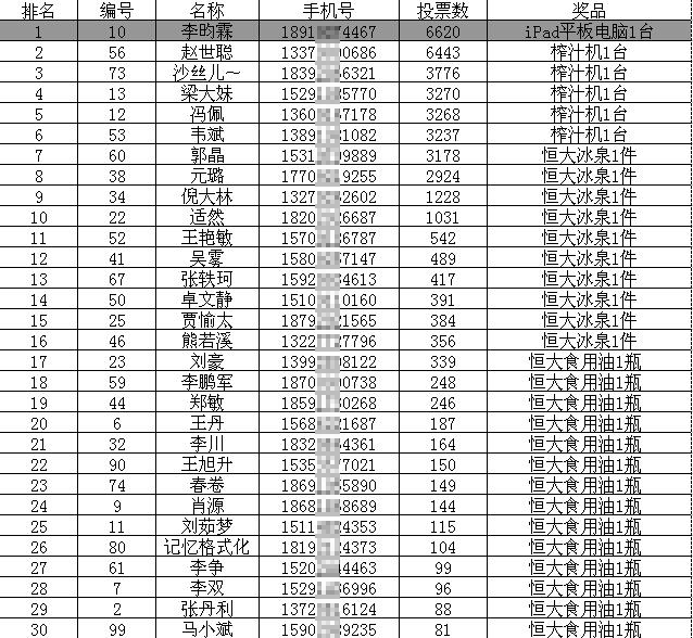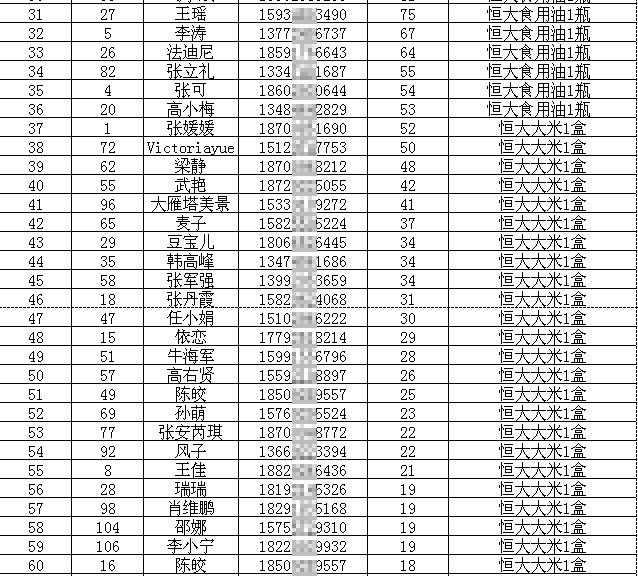 三等奖(票数榜第17-36名):恒大食用油1瓶