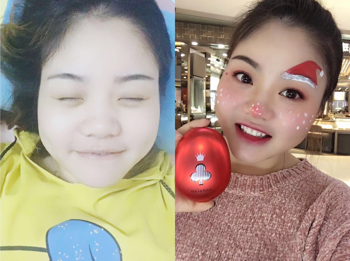 1.使用卡姿兰小彩蛋打造无暇底妆,照片需体现底妆前与底妆后的对比照,(使用美颜相机拼图)。