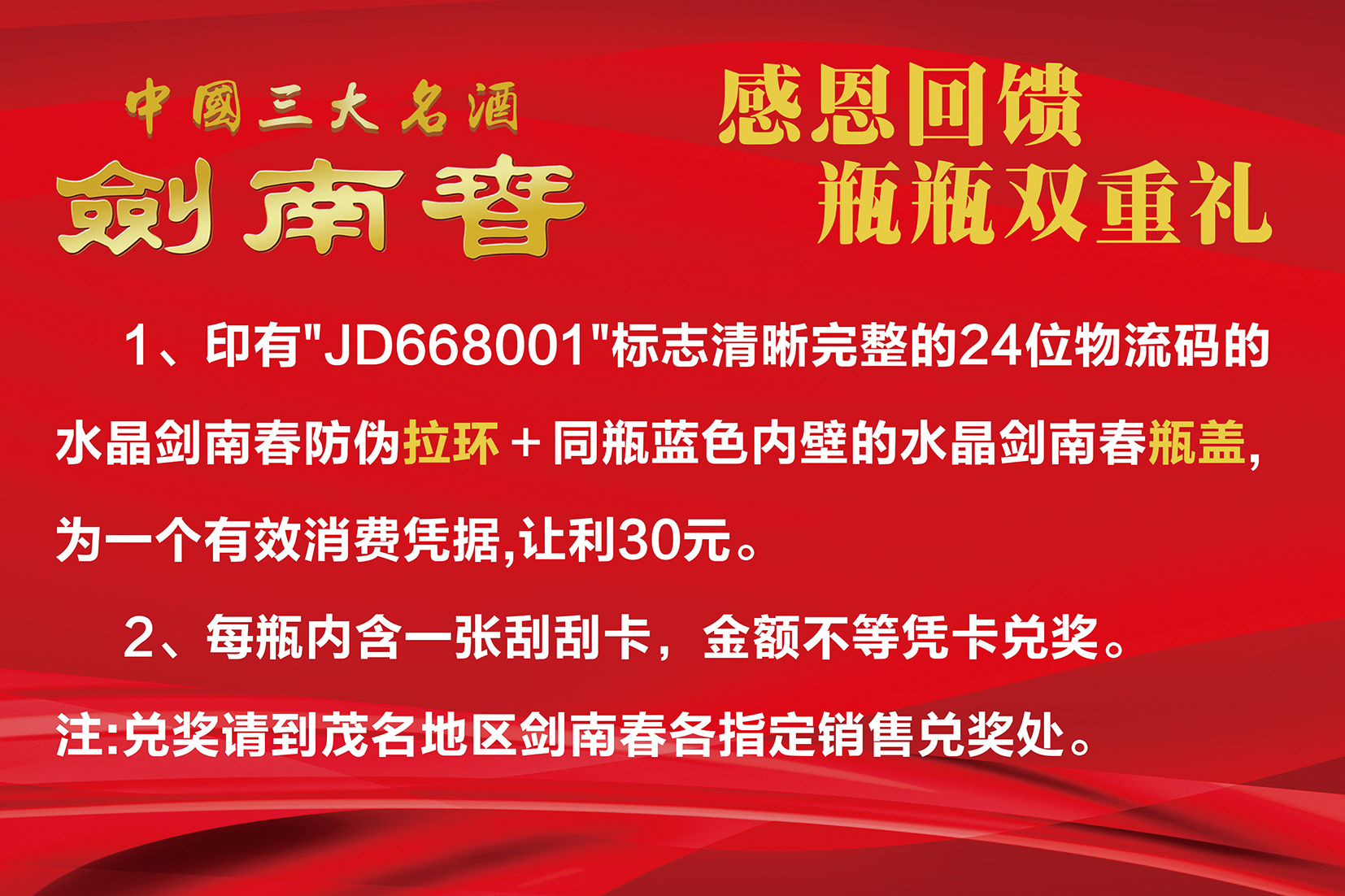 1:即日起购买水晶剑南春,凭印有“JD668001”标志,清晰完整的24位物流码,以及防伪拉环+同瓶蓝色内壁瓶盖,即可兑换30元。