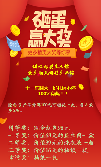 六、十一乐翻天,好礼砸不停,除秒杀产品外满100元可砸奖一次,每人最多5次,无空奖。